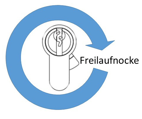 Die Freilauffunktion im Schließzylinder bewirkt, dass bei beidseitig abgezogenen Schlüsseln der Schließnocken 360° frei drehbar ist.