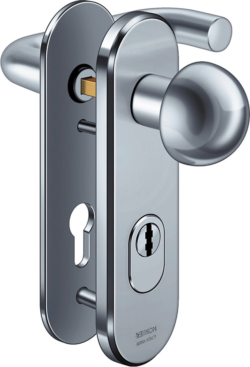 Der IKON S4K6,VAR=FS ist ein vom MPA Dortmund überwachter Stahl-Feuerschutzbeschlag in der Ausführung Rundknauf/Drücker. Kurzschild-Variante für Feuerschutztüren.