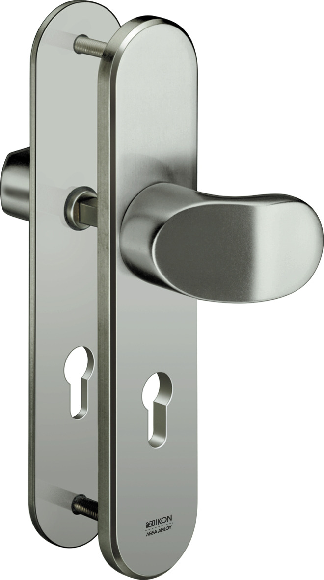 Der IKON S308 ist ein massiver Stahl-Schutzbeschlag mit PZ-Lochung für Profilzylinder. Langschild-Ausführung mit Winkelknauf/Drücker-Garnitur für Wohnungstüren.
