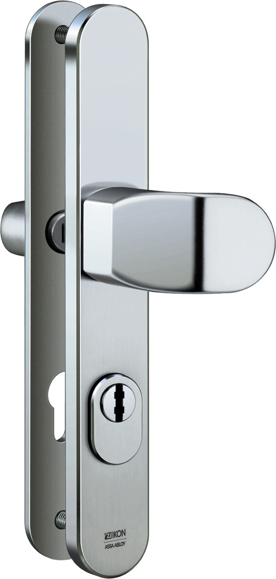 Der IKON S638 ist ein massiver Stahl-Schutzbeschlag mit Zylinderabdeckung für erhöhten Aufbohrschutz. Langschild-Ausführung mit Winkelknauf/Drücker-Garnitur für Rohrrahmentüren.