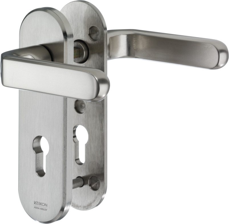 Der IKON S323 ist ein massiver Stahl-Schutzbeschlag mit PZ-Lochung für Profilzylinder. Kurzschild-Ausführung mit Drücker/Drücker-Garnitur für Wohnungstüren.