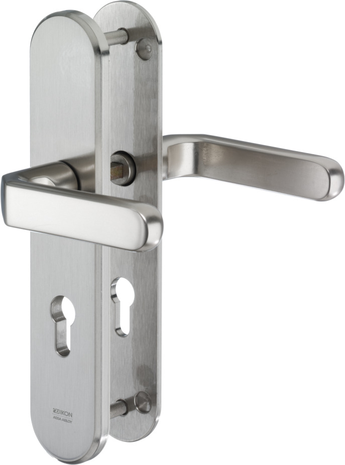 Der IKON S303 ist ein massiver Stahl-Schutzbeschlag mit PZ-Lochung für Profilzylinder. Langschild-Ausführung mit Drücker/Drücker-Garnitur für Wohnungstüren.