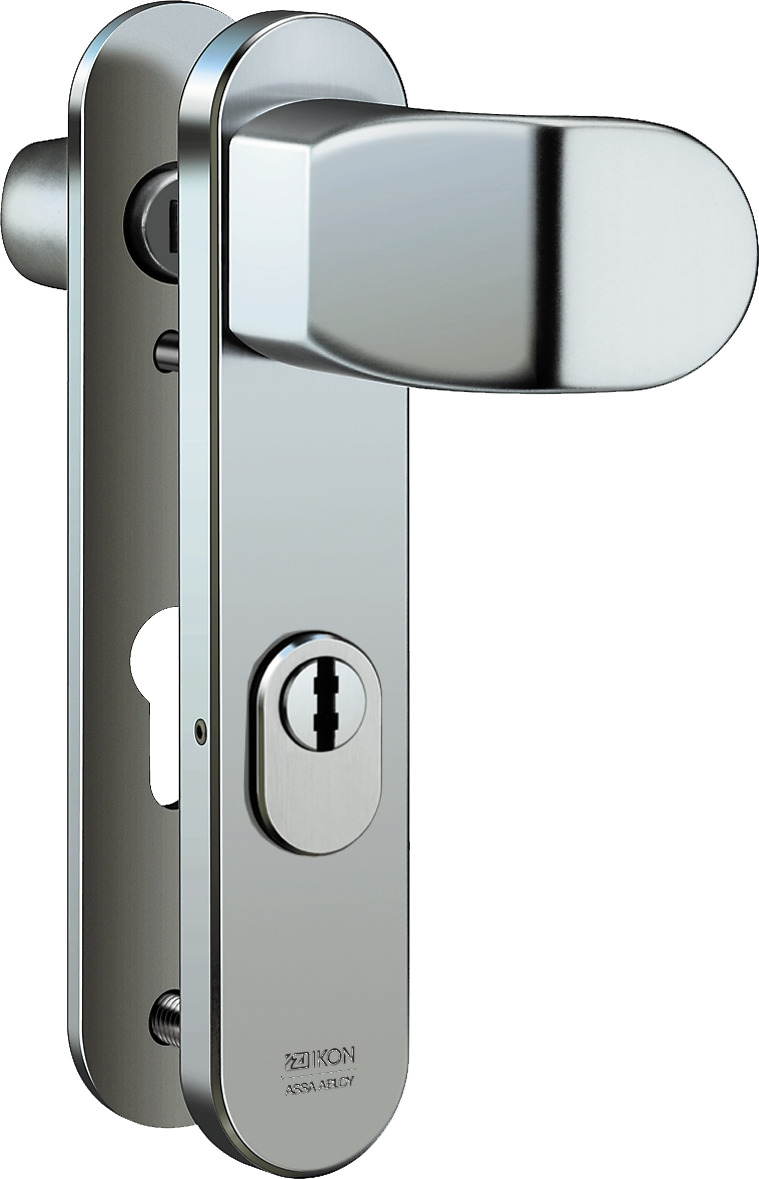 Der IKON S6B8,AUS=ZA0-IKON ist ein massiver Stahl-Schutzbeschlag mit Zylinderabdeckung für erhöhten Aufbohrschutz. Kurzschild-Ausführung mit Winkelknauf/Drücker-Garnitur für Rohrrahmentüren.